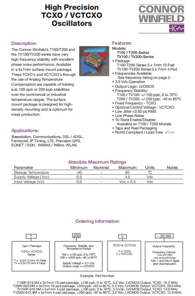 T200V-020.0M|VC-TCXO晶振|6G基站晶振,ConnorWinfield晶振,T200V有源晶振,T200V-020.0M晶振,VC-TCXO晶振,石英晶體振蕩器,7050mm晶振,頻率20MHz,電壓3.3V,工作溫度0~70°C,頻率穩(wěn)定性100ppb,低相噪晶振,高可靠性晶振,6G基站晶振,通信設備晶振,DSL / ADSL晶振,精密GPS晶振,無線網(wǎng)絡晶振,SONET/SDH設備晶振.